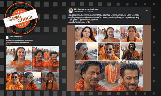 ഉത്തര്പ്രദേശിലെ പ്രയാഗ് രാജില് നടക്കുന്ന നടക്കുന്ന കുംഭമേളയില് രാജ്യത്തിനകത്തും പുറത്തുനിന്നുമായി കോടിക്കണക്കിന് പേര് പങ്കെടുക്കുന്നുവെന്നാണ് കേന്ദ്രസര്ക്കാറിന്റെ അവകാശവാദം. പ്രമുഖരടക്കം നിരവധി പേര് പങ്കെടുക്കുന്ന മഹാമേളയെന്ന തരത്തില് കുംഭമേളയെ ചിത്രീകരിക്കുന്ന നിരവധി റിപ്പോര്ട്ടുകളും ഇതിനകം പുറത്തുവന്നിട്ടുണ്ട്. അതേസമയം ബോളിവുഡ് താരങ്ങളില് ചിലര് കുംഭമേളയില് പങ്കെടുക്കുന്നുവെന്ന അടിക്കുരിപ്പോടെ ഏതാനും ചിത്രങ്ങളും ഇപ്പോള് സമൂഹമാധ്യമങ്ങളില് പ്രചരിക്കുന്നുണ്ട്. ബോളിവുഡ് താരങ്ങളായ സോനാക്ഷി സിൻഹ, സൽമാൻ ഖാൻ, ഷാരൂഖ് ഖാൻ, അക്ഷയ് കുമാർ, തെലുഗു നടൻ അല്ലു അർജുൻ, കരീന കപൂർ, രാം ചരൺ, തമന്ന തുടങ്ങിയവര് മേളയുടെ ഭാഗമായെന്ന തരത്തിലാണ് പ്രചാരണം.