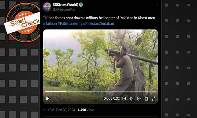 A video has gone viral showing a person shooting down a helicopter with a rocket launcher. Those sharing the video claim that it shows Taliban soldiers shooting down a Pakistani helicopter.