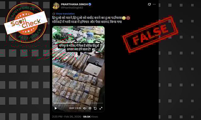 A video is being widely shared on social media in which many arms, ammunitions and cash are being seized by men in uniform. The video is circulated with a caption suggesting that the seizures occurred at one of Manipur’s mosques, where Muslims were intending to use them for killing Hindus.