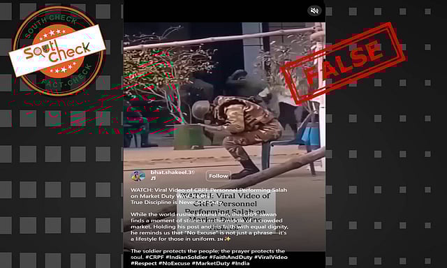 A video is being widely shared on social media in which an army personnel is seen offering namaz beside a building. The video is being shared with a caption suggesting that a Muslim man from the Indian Central Reserve Police Force was offering namaz during his duty.