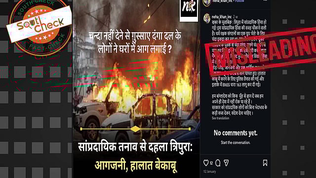 A social media user shared the image with a caption that reads, “According to the report, communal violence broke out in Tripura, and the reason behind it is shocking. A group linked to so-called religious protection outfits was collecting donations for a fair. When they demanded money from a youth belonging to another community and he refused, the self-appointed custodians of religion turned aggressive. An argument followed and soon escalated into violence. There was vandalism, arson and damage to a religious site, leaving around six people injured. Police were deployed to control the situation, and BNSS Section 163 was imposed in the area. How can we lecture Bangladesh when we fail to stop such violence in our own country? The government must send a clear message by punishing communal elements strictly, without any discrimination.” (Translated from Hindi)