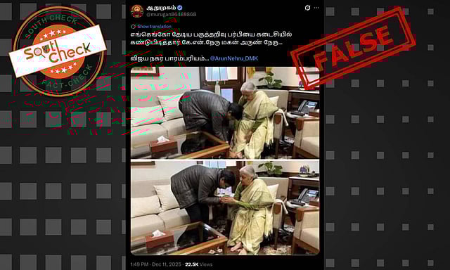 A social media user shared the images with a caption suggesting that Arun Nehru touched the feet of Sitharaman after the ED had raided them.