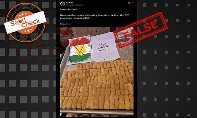 A social media user shared the image with a caption that reads, “Sweets for Terror. Gazans celebrations for isis breaking from prisons in Syria. After the STG besieged and releasing of ISIS. #GazaNow”
