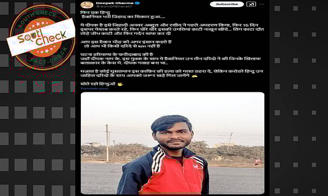 An X user shared the image and wrote, “This is Deepak, who was kidnapped by Anwar, Abdul and Rashid and brutally tortured and killed. This incident took place in Faridabad, Haryana.” (Translated from Hindi with graphic description and expletives removed)