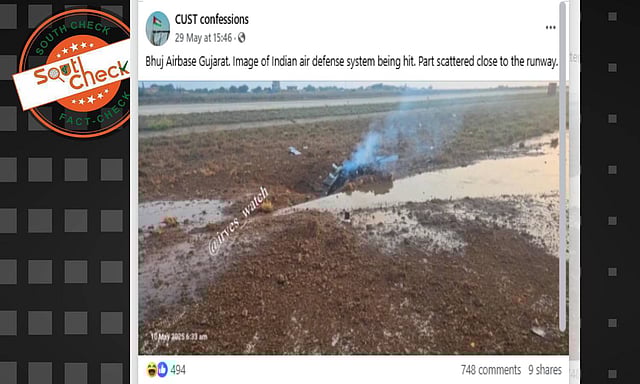 A social media user shared the video containing the image with the caption, “Bhuj Airbase Gujarat. Image of Indian air defence system being hit. Part scattered close to the runway.”