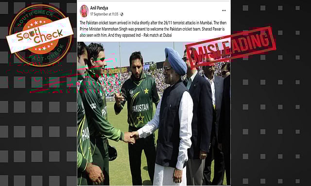 A social media user shared the image with a caption that reads, “The Pakistan cricket team arrived in India shortly after the 26/11 terrorist attacks in Mumbai. The then Prime Minister Manmohan Singh was present to welcome the Pakistan cricket team. Sharad Pawar is also seen with him. And they opposed the Ind-Pak match at Dubai.”