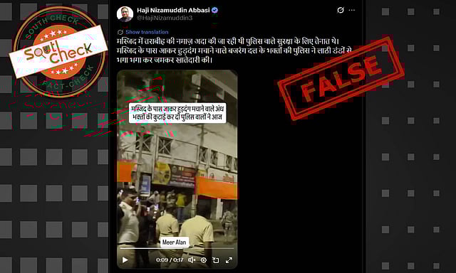 Those sharing the video claim it shows police beating Bajrang Dal members for creating a ruckus near a mosque during Tarawih prayers. Text on the video reads, “Tarawih prayers were being performed in the mosque, and police personnel were deployed for security. When some Bajrang Dal activists came near the mosque and started creating a ruckus, the police thrashed them thoroughly with lathis and sticks and chased them away.”