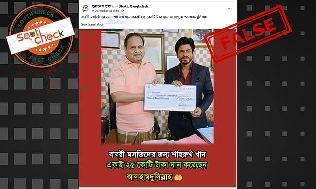 A social media user shared the image with a caption that reads, “Shah Rukh Khan alone donated Rs 25 crore for Babri Masjid. Alhamdulillah.” (Translated from Bangla)