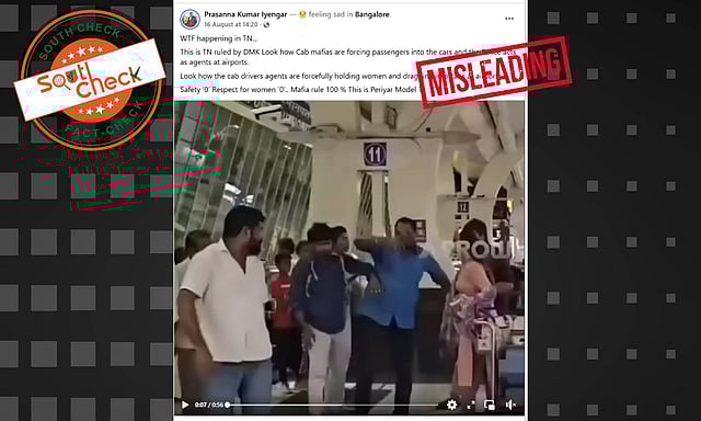 A social media user shared the video with a caption that reads, “WTF happening in TN... This is TN ruled by DMK Look how Cab mafias are forcing passengers into the cars and the Police acts as agents at airports. Look how the cab drivers agents are forcefully holding women and dragging into cabs at airports. Safety ‘0’ Respect for women ‘0’.. Mafia rule 100 % This is Periyar Model ? (sic)”