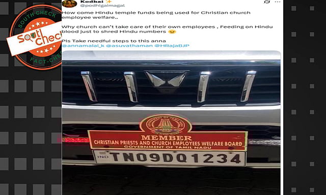 Many social media users are sharing an image of a car with a board that reads, “Member Cristian Priests and Church Employees Welfare Board, Government of Tamil Nadu.”
