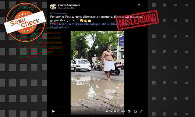 A social media user shared the video with a caption that reads, “Incompetent DMK government, a novel protest to repair the main road! #DMK_HarmfulToNationAndHome #ThievingDMK #ByeByeStalin” (Translated from Tamil)
