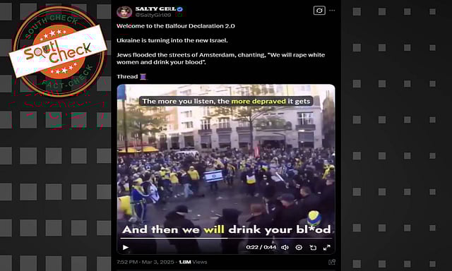 A social media user shared the video with a caption that reads, “Welcome to the Balfour Declaration 2.0. Ukraine is turning into the new Israel. Jews flooded the streets of Amsterdam, chanting, ‘We will rape white women and drink your blood’.”