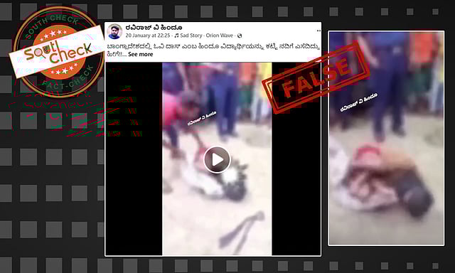 ಬಾಂಗ್ಲಾದೇಶದಲ್ಲಿ ಹಿಂದೂ ವಿದ್ಯಾರ್ಥಿಯನ್ನು ಕಟ್ಟಿ ನದಿಗೆ ಎಸೆದಿದ್ದಾರೆ ಎಂಬ ಹೇಳೀಕೆಯೊಂದಿಗೆ ಸಾಮಾಜಿಕ ಜಾಲತಾಣಗಳಲ್ಲಿ ವೀಡಿಯೊ ಒಂದು ವೈರಲ್ ಆಗುತ್ತಿದೆ. ವ್ಯಕ್ತಿಯೋರ್ವ ನೆಲದ ಮೇಲೆ ಪ್ರಜ್ಞೆ ಇಲ್ಲದೆ ಮಲಗಿದ್ದಾನೆ, ಆತನ ಕೈ-ಕಾಲುಗಳನ್ನು ಬಟ್ಟೆಯಿಂದ ಕಟ್ಟಿ ಹಾಕಲಾಗಿದೆ. ಕೆಂಪು ಶರ್ಟ್ ಧರಿಸಿದ ವ್ಯಕ್ತಿಯೋರ್ವ ಕೈ-ಕಾಲುಗಳಿಗೆ ಕಟ್ಟಿರುವ ಬಟ್ಟೆಯನ್ನು ಬಿಡಿಸುತ್ತಿರುವುದನ್ನು ವೀಡಿಯೊದಲ್ಲಿ ಕಾಣಬಹುದು.