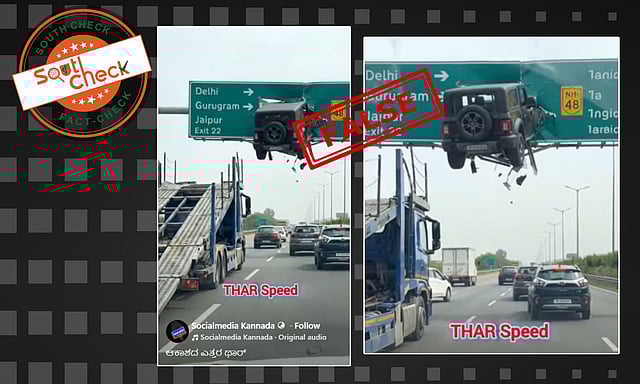 ರಾಷ್ಟ್ರೀಯ ಹೆದ್ದಾರಿಯಲ್ಲಿ ಥಾರ್ ವಾಹನವೊಂದು ಭೀಕರ ಅಪಘಾತಕ್ಕೆ ಸಿಲುಕಿದೆ ಎಂದು ಹೇಳಲಾದ ವೀಡಿಯೊ ಸಾಮಾಜಿಕ ಮಾಧ್ಯಮಗಳಲ್ಲಿ ಹರಿದಾಡುತ್ತಿದೆ (Archive). ಜೈಪುರ ಬಳಿಯ ರಾಷ್ಟ್ರೀಯ ಹೆದ್ದಾರಿ 48 ರಲ್ಲಿ ವಾಹನವು ಎತ್ತರದ ದಿಕ್ಕಿನ ಸೈನ್ಬೋರ್ಡ್ಗೆ ಡಿಕ್ಕಿ ಹೊಡೆದಿದೆ. ಚಲಿಸುತ್ತಿರುವ ಮತ್ತೊಂದು ವಾಹನದಿಂದ ಸೆರೆಹಿಡಿಯಲಾದ ವೀಡಿಯೊದಂತೆ ಸಾಮಾಜಿಕ ಮಾಧ್ಯಮಗಳಲ್ಲಿ ಈ ವೀಡಿಯೊ ಪ್ರಸಾರವಾಗುತ್ತಿದೆ.