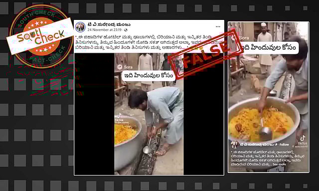ಫೇಸ್ಬುಕ್ ಬಳಕೆದಾರರೊಬ್ಬರು ಈ ವೀಡಿಯೊವನ್ನು ಹಂಚಿಕೊಂಡು, ‘‘ಈ ಜಿಹಾದಿಗಳ ಹೋಟೆಲ್ ಮತ್ತು ಢಾಬಾಗಳಲ್ಲಿ ಬಿರಿಯಾನಿ ಮತ್ತು ಇನ್ನಿತರ ತಿಂಡಿ ತಿನಿಸುಗಳನ್ನು ತಿನ್ನುವ ಹಿಂದೂಗಳೇ ನೋಡಿ ಸಕತ್ ಆಗಿರುತ್ತದೆ ಅಲ್ವಾ ಇವರು ಮಾಡಿರುವ ಬಿರಿಯಾನಿ ಮತ್ತು ಇನ್ನಿತರ ತಿಂಡಿ ತಿನಿಸುಗಳು ಮತ್ತು ಆಹಾರಗಳು’’ ಎಂದು ಬರೆದುಕೊಂಡಿದ್ದಾರೆ. (Archive)