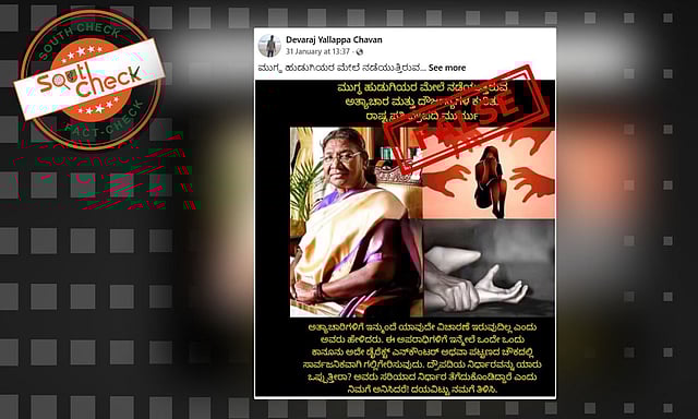 ಫೇಸ್ಬುಕ್ ಬಳಕೆದಾರರೊಬ್ಬರು ದ್ರೌಪದಿ ಮುರ್ಮು ಅವರ ಫೋಟೋ ಜೊತೆಗೆ ಈ ಪೋಸ್ಟ್ ಹಂಚಿಕೊಂಡಿದ್ದು, ‘‘ಮುಗ್ಧ ಹುಡುಗಿಯರ ಮೇಲೆ ನಡೆಯುತ್ತಿರುವ ಅತ್ಯಾಚಾರ ಮತ್ತು ದೌರ್ಜನ್ಯಗಳ ಕುರಿತು ರಾಷ್ಟ್ರಪತಿ ದ್ರೌಪದಿ ಮುರ್ಮು. ಅತ್ಯಾಚಾರಿಗಳಿಗೆ ಇನ್ಮುಂದೆ ಯಾವುದೇ ವಿಚಾರಣೆ ಇರುವುದಿಲ್ಲ ಎಂದು ಅವರು ಹೇಳಿದರು. ಈ ಅಪರಾಧಿಗಳಿಗೆ ಇನ್ಮೇಲೆ ಒಂದೇ ಒಂದು ಕಾನೂನು ಅದೇ ಡೈರೆಕ್ಟ್ ಎನ್ಕೌಂಟರ್ ಅಥವಾ ಪಟ್ಟಣದ ಚೌಕದಲ್ಲಿ ಸಾರ್ವಜನಿಕವಾಗಿ ಗಲ್ಲಿಗೇರಿಸುವುದು. ದ್ರೌಪದಿಯ ನಿರ್ಧಾರವನ್ನು ಯಾರು ಒಪ್ಪುತ್ತೀರಾ? ಅವರು ಸರಿಯಾದ ನಿರ್ಧಾರ ತೆಗೆದುಕೊಂಡಿದ್ದಾರೆ ಎಂದು ನಿಮಗೆ ಅನಿಸಿದರೆ! ದಯವಿಟ್ಟು ನಮಗೆ ತಿಳಿಸಿ.’’ ಎಂದು ಬರೆದುಕೊಂಡಿದ್ದಾರೆ. (Archive)