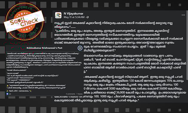 ഇന്ത്യ പാക്കിസ്ഥാന് സംഘര്ഷത്തിന്റെ പശ്ചാത്തലത്തില് ഇന്ത്യന് സൈന്യത്തിന് ആയുധങ്ങള് വാങ്ങാന് പൊതുജനങ്ങളില്നിന്ന് സംഭാവന സ്വീകരിക്കുന്നുവെന്നും ഇതിനായി ബാങ്ക് അക്കൗണ്ട് തുടങ്ങിയെന്നും അവകാശവാദത്തോടെ ഒരു സന്ദേശം സമൂഹമാധ്യമങ്ങളില് പ്രചരിക്കുന്നു. പ്രധാനമന്ത്രി നരേന്ദ്രമോദിയുടെ അധ്യക്ഷതയില് കഴിഞ്ഞ ദിവസം ചേര്ന്ന കേന്ദ്ര മന്ത്രിസഭാ യോഗത്തിലാണ് തീരുമാനമെന്നും ഇതില് പറയുന്നു.