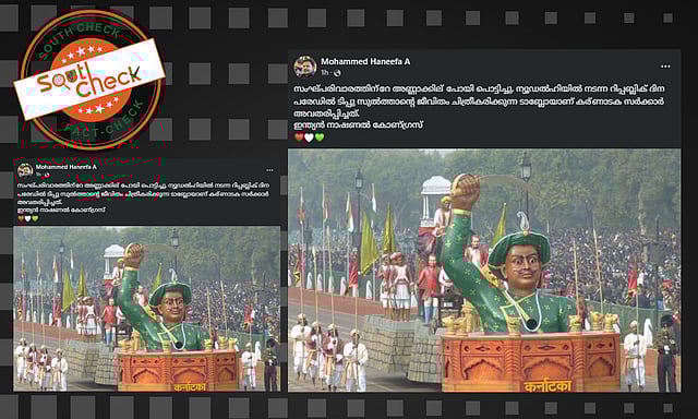 സംഘപരിവാര് മതവിദ്വേഷത്തിനെതിരെ നിലപാടുയര്ത്തി കര്ണാടക റിപ്പബ്ലിക് ദിന പരേഡില് ടിപ്പുസുല്ത്താന്റെ ജിവിതം ആസ്പദമാക്കി നിശ്ചലദൃശ്യം അവതരിപ്പിച്ചതായി സമൂഹമാധ്യമങ്ങളില് പ്രചാരണം. റിപ്പബ്ലിക് ദിന പരേഡിലെ കര്ണാടകയുടെ പ്ലോട്ടിന്റെ ചിത്രസഹിതമാണ് പ്രചാരണം. സംഘപരിവാറിന്റെ മതവിദ്വേഷത്തിനെതിരെ കര്ണാടകയിലെ കോണ്ഗ്രസ് സര്ക്കാര് സ്വീകരിച്ച നിലപാടിന്റ പ്രതിഫലനമാണിതെന്ന അവകാശവാദത്തോടെ നിരവധി പേരാണ് ചിത്രം പങ്കുവെയ്ക്കുന്നത്.