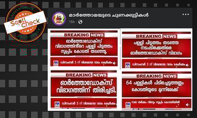 ക്രൈസ്തവ സഭകളുടെ പള്ളി അവകാശവുമായി ബന്ധപ്പെട്ട തര്ക്കത്തില് കേസ് സുപ്രീംകോടതി പരിഗണിക്കാനിരിക്കെ ഓര്ത്തഡോക്സ് വിഭാഗത്തിന് തിരിച്ചടിയെന്ന തരത്തില് മനോരമ ന്യൂസ് വാര്ത്ത നല്കിയതായി സമൂഹമാധ്യമങ്ങളില് പ്രചാരണം. മനോരമ ന്യൂസിന്റെ നാല് സ്ക്രീന്ഷോട്ടുകള് സഹിതമാണ് പ്രചാരണം. ഓര്ത്തഡോക്സ് വിഭാഗം 64 പള്ളികള് പിടിച്ചെടുത്തത് കോടതിയുടെ പരിഗണനയില് വരുന്നുവെന്നും കേസ് സുപ്രീംകോടതി ഡിസംബര് 3ന് പരിഗണിക്കുമെന്നുമാണ് സ്ക്രീന്ഷോട്ടുകളില് നല്കിയിരിക്കുന്നത്.