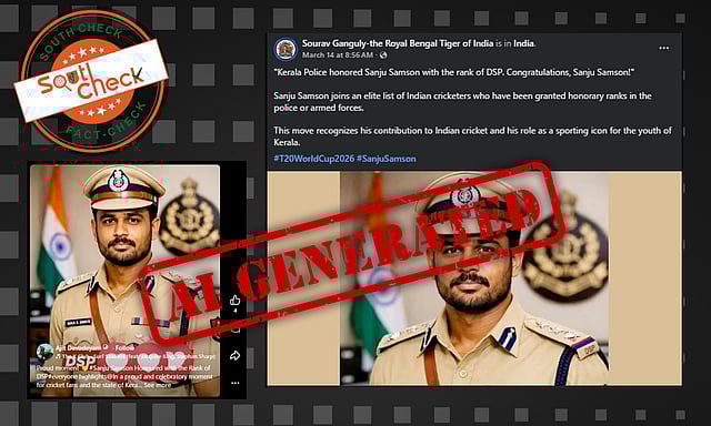 സഞ്ജു സാംസണിന് കേരള പൊലീസ് ജോലി നല്കി ആദരിച്ചുവെന്ന തരത്തില് പ്രചരിക്കുന്ന ചിത്രം എഐ നിര്മിതമാണെന്ന് ഇതോടെ സ്ഥിരീകരിച്ചു.