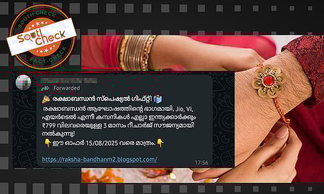 രക്ഷാബന്ധന് ദിനത്തോടനുബന്ധിച്ച് ടെലികോം കമ്പനികള് സൗജന്യ റീച്ചാര്ജ് ഓഫര് നല്കുന്നതായി സമൂഹമാധ്യമങ്ങളില് പ്രചാരണം. പ്രചരിക്കുന്ന വാട്സാപ്പ് സന്ദേശത്തില് വിഐ, ജിയോ, എയര്ടെല് എന്നീ കമ്പനികളുടെ ഉപഭോക്താക്കള്ക്ക് 799 രൂപവരെ സൗജന്യ റീച്ചാര്ജ് നല്കുന്നതായാണ് പ്രചാരണം.