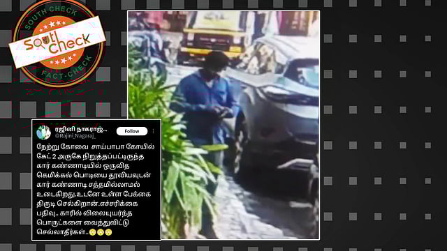 மர்ம நபர் ஒருவர் கார் கண்ணாடியை உடைத்து அதில் இருக்கும் பையை திருடிச் செல்லும் காட்சி சமூக வலைதளங்களில் (Archive) வைரலாகி வருகிறது. இந்நிகழ்வு நேற்று (தேதி குறிப்பிடப்படவில்லை) கோயம்புத்தூரில் உள்ள சாய்பாபா கோவிலின் இரண்டாவது நுழைவு வாயிலில் நடைபெற்றதாக கூறி பரப்பி வருகின்றனர். மேலும், அந்த நபர் ஒருவித கெமிக்கல் பொடியைப் பயன்படுத்தி காரின் கண்ணாடியை உடைப்பதாக அப்பதிவில் குறிப்பிடப்பட்டுள்ளது.