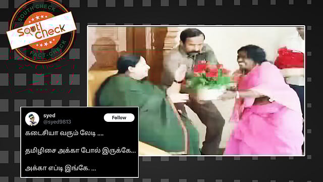 அதில், 3:29 முதல் 3:40 வரையிலான பகுதியில் வைரலாகும் காணொலியில் வரக்கூடிய அதே பெண்ணின் முகம் தெளிவாக தெரிகிறது. அவர், ஜெயலலிதாவின் காலில் விழுந்து வாழ்த்தி ஆசி பெறுகிறார். அவரது முகத்தையும் தமிழிசை சௌந்தர்ராஜன் முகத்தையும் ஒப்பிட்டு பார்க்கையில் இருவரும் வெவ்வேறு நபர்கள் என்பதும் தெரியவந்தது.