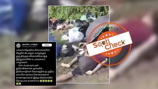 வங்கதேசத்தில் பொதுமக்கள் மற்றும் மாணவ அமைப்பினர் இணைந்து நடத்திய போராட்டத்தால் அங்கு வன்முறை வெடித்தது. இதனையடுத்து முகமது யூனுஸ் தலைமையிலான இடைக்கால அரசு அமைக்கப்பட்டது. இந்நிலையில், “பங்களாதேஷில் கிராமங்களில் சிதறிக் கிடக்கும், யாருக்கும் ஒரு தீங்கும் விளைவிக்காத்த இந்துக்களின் உடல்களைப் பாருங்கள். 1921-ல் நம் நாட்டின் துரோகிகளான முஸ்லிம் தீவிரவாதிகள் கேரளத்தில் நடத்திய மாப்பிள கலவர கொலைகளை காணாதவர்கள் இந்த வீடியோவில் நேரடியாக காணலாம்” என்ற கேப்ஷனுடன் காணொலி ஒன்று சமூக வலைதளங்களில் (Archive) வைரலாகி வருகிறது. அதில், ஆற்றங்கரை ஓரத்தில் பினக்குவியல்கள் சிதறிக்கிடப்பது போன்ற காட்சிகள் இடம்பெற்றுள்ளன. இறந்து கிடப்பது இந்துக்கள் என்று கூறி பரப்பி வருகின்றனர்.
