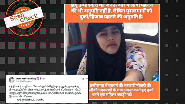 “சத்தீஸ்கர் மாநிலம் பிலாஸ்பூரில் தேர்வு எழுதும் அறைக்கு பின்பகுதியில் விலை உயர்ந்த வாக்கிடாக்கி, கேமரா, டேப் மற்றும் இரண்டு பேக் நிறைய உபகரணங்கள் வைத்திருந்த இஸ்லாமிய பெண்… ஹிஜாபின் பயன்கள்” என்ற கேப்ஷனுடன் சமூக வலைதளங்களில் (Archive) காணொலி வைரலாகி வருகிறது. அதில் வாக்கி டாக்கி, செல்போன் உள்ளிட்ட கருவிகளை வைத்துள்ள ஹிஜாப் அணிந்த பெண் ஒருவர் ஆட்டோவிற்கு உள்ளே அமர்ந்துள்ள காட்சி பதிவாகியுள்ளது.