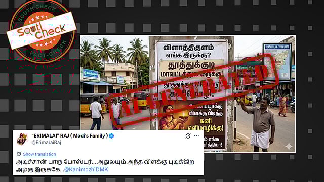 அந்தப் போஸ்டரில், “விளாத்திகுளம் எங்க இருக்கு? தூத்துக்குடி மாவட்டத்துல இருக்கு! தூத்துக்குடி MP யாரு? கனிமொழி! மணிப்பூருக்கு விளக்கு பிடித்த கனிமொழிக்கு இந்த விளாத்திக்குளம் எங்க இருக்குனு தெரியல பாத்தியா!” என்ற வாசகங்கள் இடம்பெற்றுள்ளன. மணிப்பூர் கலவரத்திற்காகக் குரல் கொடுத்த கனிமொழி, தன் சொந்தத் தொகுதியில் நடந்த சம்பவத்தைக் கண்டுகொள்ளவில்லை என்று விமர்சிக்கும் நோக்கில் இந்தப் படம் பகிரப்பட்டு வருகிறது