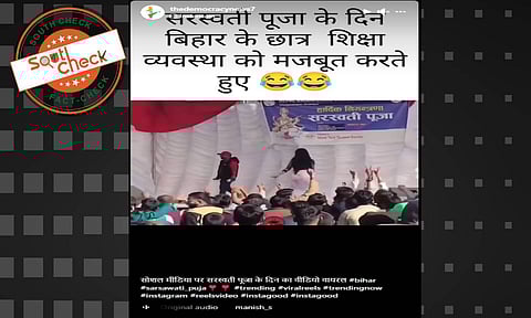 In the above backdrop, a video is being widely shared on social media in which a girl can be seen dancing to a song on stage while a crowd of men cheer her on. Those sharing the video claim it shows the video was shot during a Saraswati Puja function in a Bihar college.