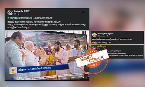 We Cover Media എന്ന യൂട്യൂബ് ചാനലില് പങ്കുവെച്ച വീഡിയോയില് മമ്മൂട്ടിയും മോഹന്ലാലും ജയറാമും ഉള്പ്പെടെ ചലചിത്രതാരങ്ങള് നില്ക്കുന്ന വഴിയിലൂടെ പ്രധാനമന്ത്രി കടന്നുവരുന്നതു മുതല് തിരിച്ചുപോകുന്നതുവരെയുള്ള തുടര്ച്ചയായ ദൃശ്യങ്ങള് കണ്ടെത്തി.