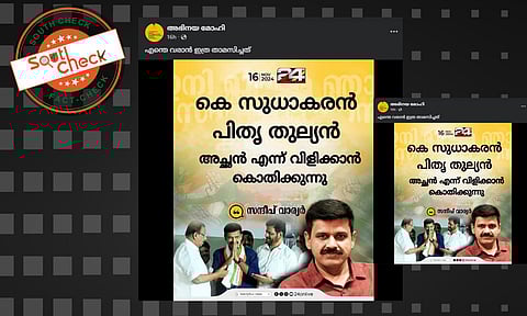 ബിജെപി വക്താവായിരുന്ന സന്ദീപ് വാര്യര് കോണ്ഗ്രസില് ചേര്ന്നതിന് പിന്നാലെ അദ്ദേഹം കെപിസിസി പ്രസിഡന്റ് കെ സുധാകരനെ പിതൃതുല്യനെന്ന് വിശേഷിപ്പിച്ചതായി സമൂഹമാധ്യമങ്ങളില് പ്രചാരണം. അച്ഛനെന്ന് വിളിക്കാന് കൊതിക്കുന്നുവെന്ന് സന്ദീപ് വാര്യര് പറഞ്ഞതായി 24 ന്യൂസിന്റെ ലോഗോ സഹിതം വാര്ത്താകാര്ഡ് രൂപത്തിലാണ് പ്രചാരണം.