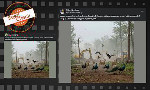 ഹൈദരാബാദ് കേന്ദ്ര സര്വകലാശാലയ്ക്ക് സമീപത്തെ ഗച്ചിബൗളി മേഖലയിലെ ഭൂമിയില് അവകാശമുന്നയിച്ച തെലങ്കാന സര്ക്കാര് പ്രസ്തുത സ്ഥലം ഐടി അടിസ്ഥാനസൗകര്യ വികസനത്തിനായി ഉപയോഗിക്കാനൊരുങ്ങുകയാണ്. ഇതിന്റെ ഭാഗമായി സ്ഥലത്തെ മരങ്ങള് മുറിക്കുന്നതിനെതിരെ സര്വകലാശാലയിലെ വിദ്യാര്ത്ഥികളും പരിസ്ഥിതിപ്രവര്ത്തകരും രാഷ്ട്രീയ പാര്ട്ടികളും രംഗത്തെത്തിയിരുന്നു. ഈ പശ്ചാത്തലത്തിലാണ് പ്രസ്തുത മേഖലയില് മരം മുറിക്കുന്ന സമയത്തെ ദൃശ്യങ്ങളെന്ന തരത്തില് ഒരു ചിത്രം സമൂഹമാധ്യമങ്ങളില് പ്രചരിക്കുന്നത്. ജെസിബി ഉപയോഗിച്ച് മരങ്ങള് മുറിയ്ക്കുന്നതിനിടെ മയിലും മാനും മറ്റുചില പക്ഷികളുമെല്ലാം അവിടെനിന്ന് രക്ഷപ്പെടുന്ന ചിത്രമെന്ന തരത്തിലാണ് പ്രചാരണം.