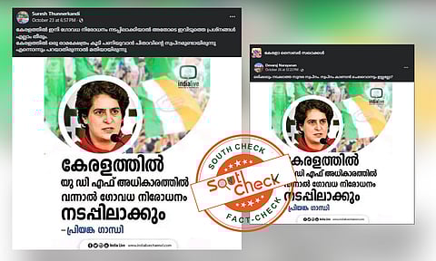 വയനാട് ഉപതിരഞ്ഞെടുപ്പിന്റെ പ്രചാരണം സജീവമാകുന്ന സാഹചര്യത്തില് പ്രിയങ്കാഗാന്ധിയുടേതെന്ന തരത്തില് വാര്ത്താ കാര്ഡ് സമൂഹമാധ്യമങ്ങളില് പ്രചരിക്കുന്നു,. ഗോവധ നിരോധനവുമായി ബന്ധപ്പെട്ടാണ് പ്രചാരണം. കേരളത്തില് യുഡിഎഫ് അധികാരത്തിലെത്തിയാല് ഗോവധ നിരോധനം നടപ്പാക്കുമെന്ന് പ്രിയങ്ക ഗാന്ധി പറഞ്ഞതായാണ് ഇന്ത്യാലൈവ് എന്ന ഓണ്ലൈന് ചാനലിന്റെ പേരിലുള്ള വാര്ത്താ കാര്ഡ് സഹിതം പ്രചാരണം.