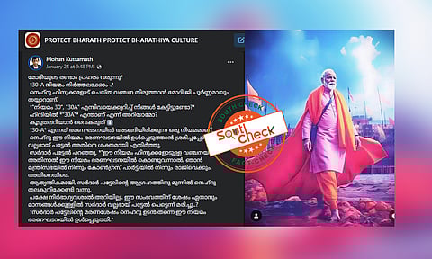 ഹിന്ദുമതപഠനം വിലക്കുന്ന ഭരണഘടനയിലെ അനുച്ഛേദം 30-A റദ്ദാക്കാന് കേന്ദ്രസര്ക്കാര് തയ്യാറെടുക്കുന്നുവെന്ന അവകാശവാദത്തോടെ സന്ദേശം സമൂഹമാധ്യമങ്ങളില് പ്രചരിക്കുന്നു. നരേന്ദ്രമോദിയുടെ രണ്ടാം പ്രഹരം എന്ന വിശേഷണത്തോടെ അദ്ദേഹത്തിന്റെ ചിത്രസഹിതം പ്രചരിപ്പിക്കുന്ന സന്ദേശത്തില് സ്വകാര്യവിദ്യാഭ്യാസ സ്ഥാപനങ്ങളിലുള്പ്പെടെ ഹിന്ദുമതപഠനം വിലക്കുന്ന നിയമമാണ് ഭരണഘടനയിലെ ആര്ട്ടിക്ക്ള് 30-A എന്നും അതേസമയം ആര്ട്ടിക്ക്ള് 30 പ്രകാരം മുസ്ലിം, ക്രൈസ്തവ, സിഖ് വിഭാഗങ്ങള്ക്ക് അവരുടെ മതപഠന സ്ഥാപനങ്ങള് തുടങ്ങാന് അനുമതിയുണ്ടെന്നും പോസ്റ്റില് അവകാശപ്പെടുന്നു.