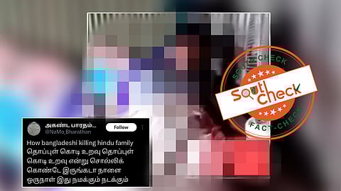 வங்கதேசத்தில் அரசுக்கு எதிராக போராட்டம் நடைபெற்று வருகிறது. இதன் தொடர்ச்சியாக அந்நாட்டு பிரதமர் ஷேக் ஹசீனா நாட்டைவிட்டு வெளியேறினார். இந்நிலையில், “How bangladeshi killing hindu family தொப்புள் கொடி உறவு தொப்புள் கொடி உறவு என்று சொல்லிக் கொண்டே இருங்கடா நாளை ஒருநாள் இது நமக்கும் நடக்கும்” என்ற கேப்ஷனுடன் சமூக வலைதளங்களில் (Archive) காணொலி ஒன்று வைரலாகி வருகிறது. அதில், ஆண் பெண் மற்றும் குழந்தைகள் இருவர் என நான்கு பேர் தூக்கில் சடலமாக தொங்குவது காட்சிப்படுத்தப்பட்டுள்ளது.
