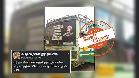 “எந்தக் கொம்பனாலும் குறைசொல்ல முடியாத திராவிட மாடல் ஆட்சியில் ஓடும் பஸ்” என்ற கேப்ஷனுடன் உடைந்த பேருந்தின் பின்புறம் கயிற்றால் கட்டப்பட்டது போன்ற புகைப்படம் சமூக வலைதளங்களில் (Archive) வைரலாகி வருகிறது. இப்பேருந்து தற்போதைய திமுக ஆட்சியில் இயங்குவதாக கூறி பரப்பி வருகின்றனர்.