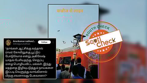 தேர்தல் பிரச்சாரத்தின் போது ராமர் கோயிலை மூடிவிடுவேன் என்று சமாஜ்வாதி கட்சி தலைவர் அகிலேஷ் யாதவ் கூறியதற்காக அவர் மீது செருப்பு வீசப்படுவதாக சமூக வலைதளங்களில் காணொலி ஒன்று வைரலாகி வருகிறது.
