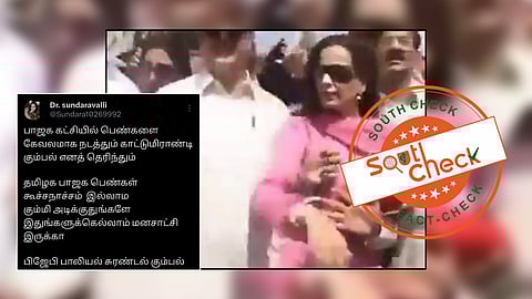 “பாஜக கட்சியில் பெண்களை கேவலமாக நடத்தும் காட்டுமிராண்டி கும்பல் எனத் தெரிந்தும் தமிழக பாஜக பெண்கள் கூச்சநாச்சம் இல்லாம கும்மி அடிக்குதுங்களே இதுங்களுக்கெல்லாம் மனசாட்சி இருக்கா பிஜேபி பாலியல் சுரண்டல் கும்பல்” என்ற கேப்ஷனுடன் சமூக செயல்பாட்டாளர் சுந்தரவல்லி தனது எக்ஸ் பக்கத்தில் காணொலி ஒன்றை பதிவிட்டுள்ளார். அதில், பேரணியின் போது பெண் ஒருவரை ஆண் ஒருவர் தவறாக தொடுவது போன்று காட்சி பதிவாகியுள்ளது.